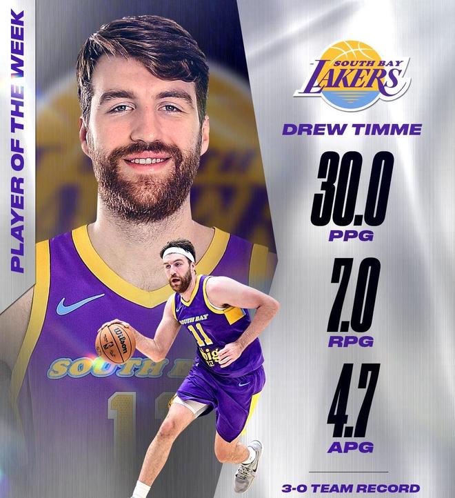 蒂米获得了本赛季首周G联赛最佳球员称号,他在首周的比赛场均得到30.0分7.0篮板4.7助攻,率领南湾湖人取得3胜0负的战绩。蒂米出生于2000年9月9日,是2023年落选秀。身高2米08的他大学时代效力冈萨加大学,是一位进攻火力出众的内线球员。大四赛季,蒂米场均得到21.2分7.5篮板3.2助攻1.0封盖,投篮命中率61.6%,三分命中率16.7%,罚球命中率63.2%。